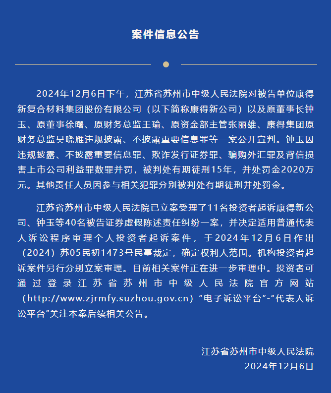 康得新复合材料集团股份有限公司及其多位前高管因违规披露、不披露重要信息罪等一案被公开宣判,原董事长钟玉被判有期徒刑15年,并处罚金2020万元,其他高管也分别被判有期徒刑并处罚金。