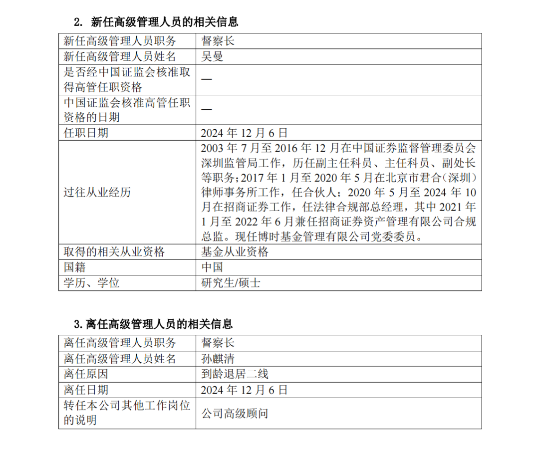 12月6日晚间,博时基金正式发布公告,宣布吴曼正式就任公司督察长一职。此前,该职位由原督察长孙麒清担任,其因到龄退居二线,转任公司高级顾问。