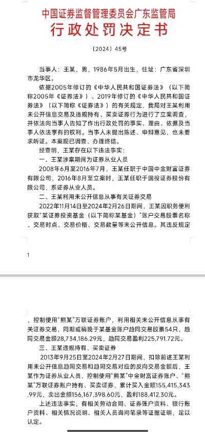 广东证监局对王某的违规行为进行了严厉处罚。王某不仅利用未公开信息进行趋同交易,还违规持有、买卖证券。其利用未公开信息从事证券交易行为,获利22.58万元,被没收违法所得并处罚款80万元;违规持有、买卖证券行为,获利18.84万元,同样被没收违法所得并处罚款18万元。两项违规合计,王某被没收违法所得41.42万元,并被处以98万元的罚款。