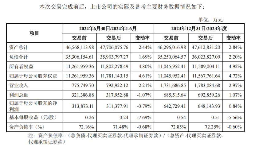草案还对收购前后的财务指标进行了对比分析。从数据上看,交易完成后,国信证券的资产总额、所有者权益、营业收入均有所增长,但幅度有限。以2024年上半年营业收入为例,交易前为77.57亿元,交易后增至79.29亿元,增长率仅为2.21%。而归母净利润方面,交易前为31.39亿元,交易后略降至31.14亿元,变动率为-0.79%。但若以2023年度数据对比,则呈现小幅增长。