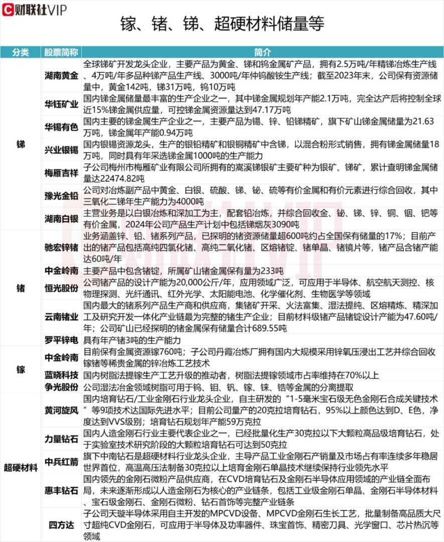 在超硬材料领域,黄河旋风、力量钻石、中兵红箭、惠丰钻石和四方达等公司均拥有一定储量。而在锑、锗、镓等领域,湖南黄金、华钰矿业、中金岭南、云南锗业等企业也具备丰富的资源储备。这些公司在各自领域拥有显著优势,未来发展潜力巨大。