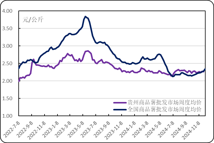图2. 近年全国和贵州商品薯批发周度均价走势图