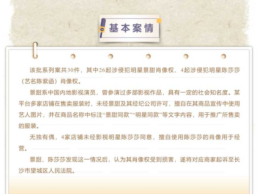 据长沙市望城区法院微信公众号消息,这批案件主要是因为多家平台店铺在未经授权的情况下,擅自使用景甜和陈莎莎的肖像进行商品宣传,并在商品名称中标注“明星同款”等字样。景甜和陈莎莎发现后,认为自己的肖像权受到侵害,遂将对应商家起诉至法院。