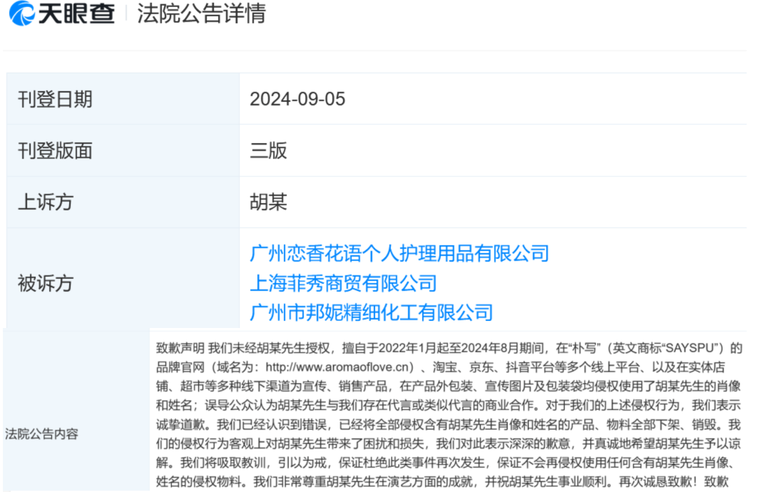 此外,演员胡歌也曾因肖像权和姓名权被侵犯,起诉了多家公司。据天眼查显示,上海市浦东新区人民法院曾向合肥梵冈影视传媒有限公司公告送达开庭传票,涉及胡歌起诉上海谷柏特汽车科技有限公司、洛克优(上海)新材料科技有限责任公司肖像权、姓名权纠纷案件。同时,还有三家公司因未经胡歌授权使用其肖像和姓名进行产品宣传和销售,被强制执行20万元,并向胡歌公开致歉。
