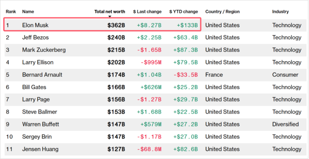 在上周五的交易中,特斯拉股价飙升超过5%,年内累计涨幅更是突破了56%,市值一举跃升至1.25万亿美元。伴随特斯拉股价的强劲上扬,马斯克的身价也随之达到了新的高峰。