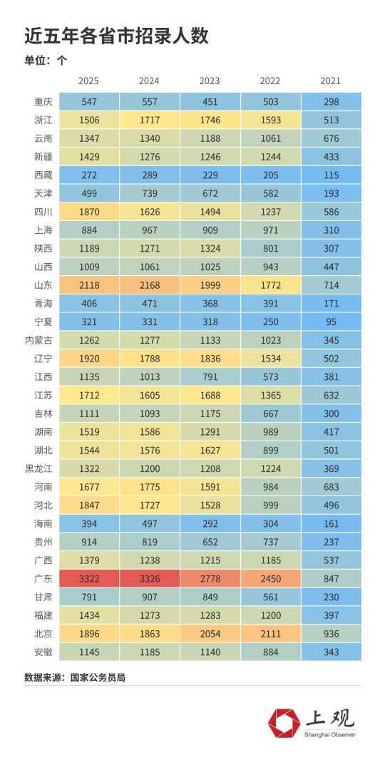 从岗位开放数量来看,宁夏、西藏和青海的岗位数最少,而广东、山东、河南则是岗位开放最多的地区。此外,与前几年相比,2023至2025年的国考招录人数增长放缓,部分省市甚至出现招录人数缩减的情况。