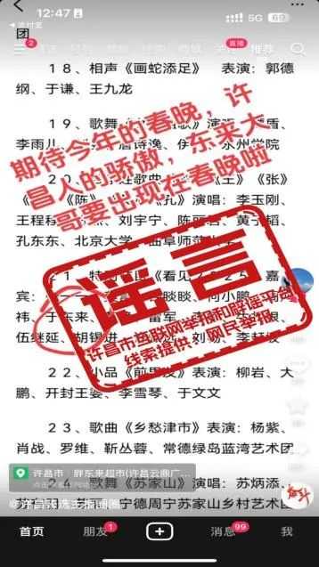 “清朗河南”微信公众号发布消息,12月7日,许昌市委网信办接到群众举报,指出短视频账号“许昌臻选主播圈圈”在网络上发布了胖东来商贸集团有限公司董事长于东来即将参加央视2025年春节联欢晚会的视频信息。经过许昌市委网信办向胖东来商贸集团有限公司求证,公司明确回应,从未收到参加央视2025年春节联欢晚会节目的邀请。该视频信息被证实为虚假谣言,其中涉及的央视2025年春晚节目单完全是由该自媒体账号编造的。