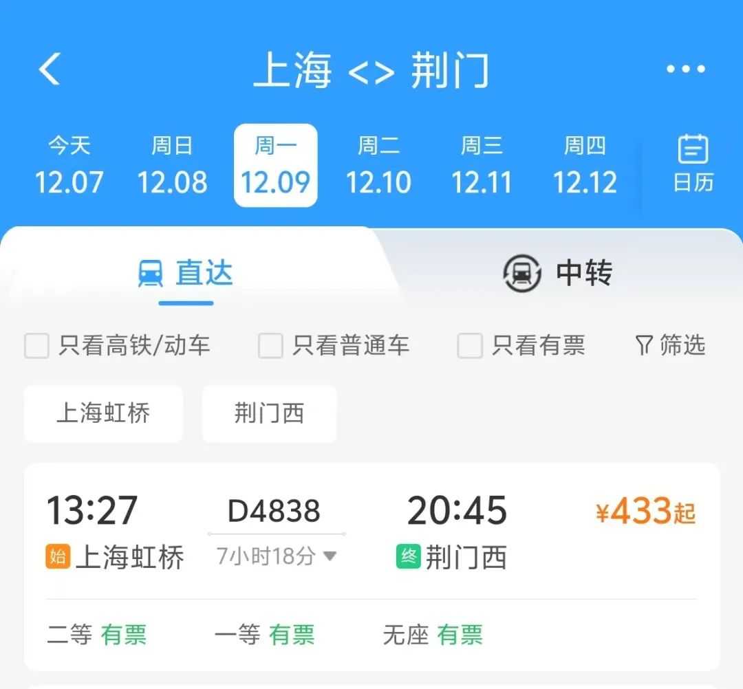 铁路12306 App显示,12月9日起,多个一线城市将开行至荆门的高铁、动车。其中,上海与荆门将双向开行1对动车组列车,D4838次列车13:27从上海虹桥站发车,7个多小时后抵达荆门西站,最低票价433元。