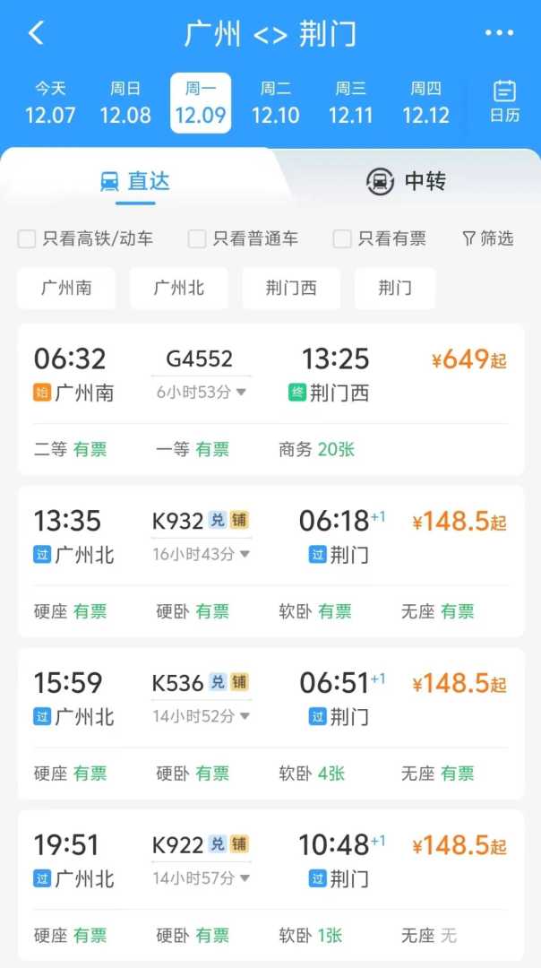 广州与荆门也将双向对开1对高铁列车,G4552次列车06:32从广州南站发车,约7小时到达荆门西站,最低票价649元,比普通快速列车节省约7-9个小时。