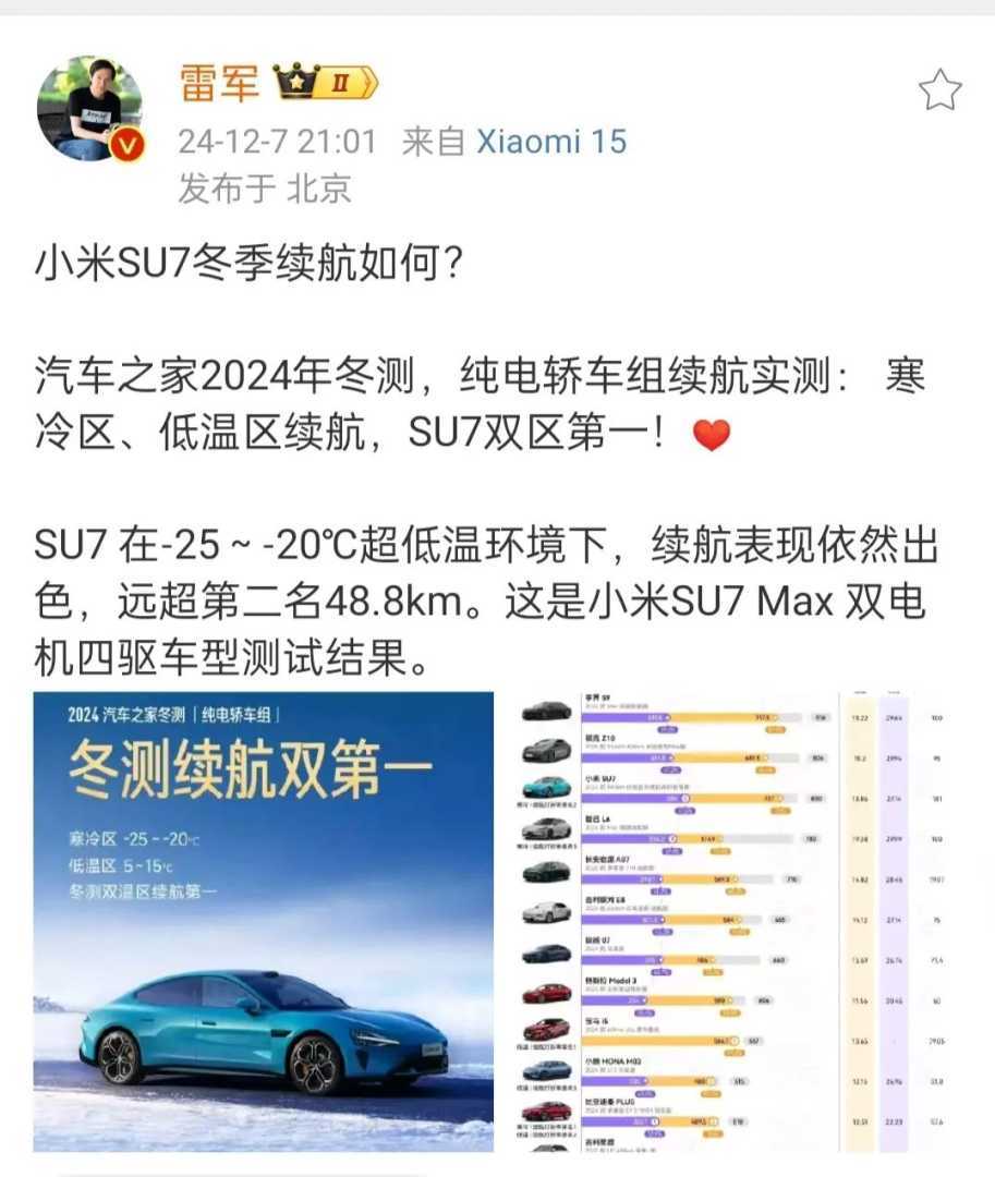 近日,小米创始人雷军在微博透露,小米SU7在汽车之家2024年冬测的纯电轿车组续航实测中,取得了寒冷区、低温区续航双区第一的好成绩。在5~15℃的低温环境下,小米SU7实际续航里程达到了737公里,续航达成率为91%;在-25~-20℃的超低温环境中,实际续航里程也有385公里,续航达成率为47.5%。这一成绩得益于小米SU7 Max版本搭载的双电机四驱动力系统,虽然配置较高能耗,但续航表现依然领先。
