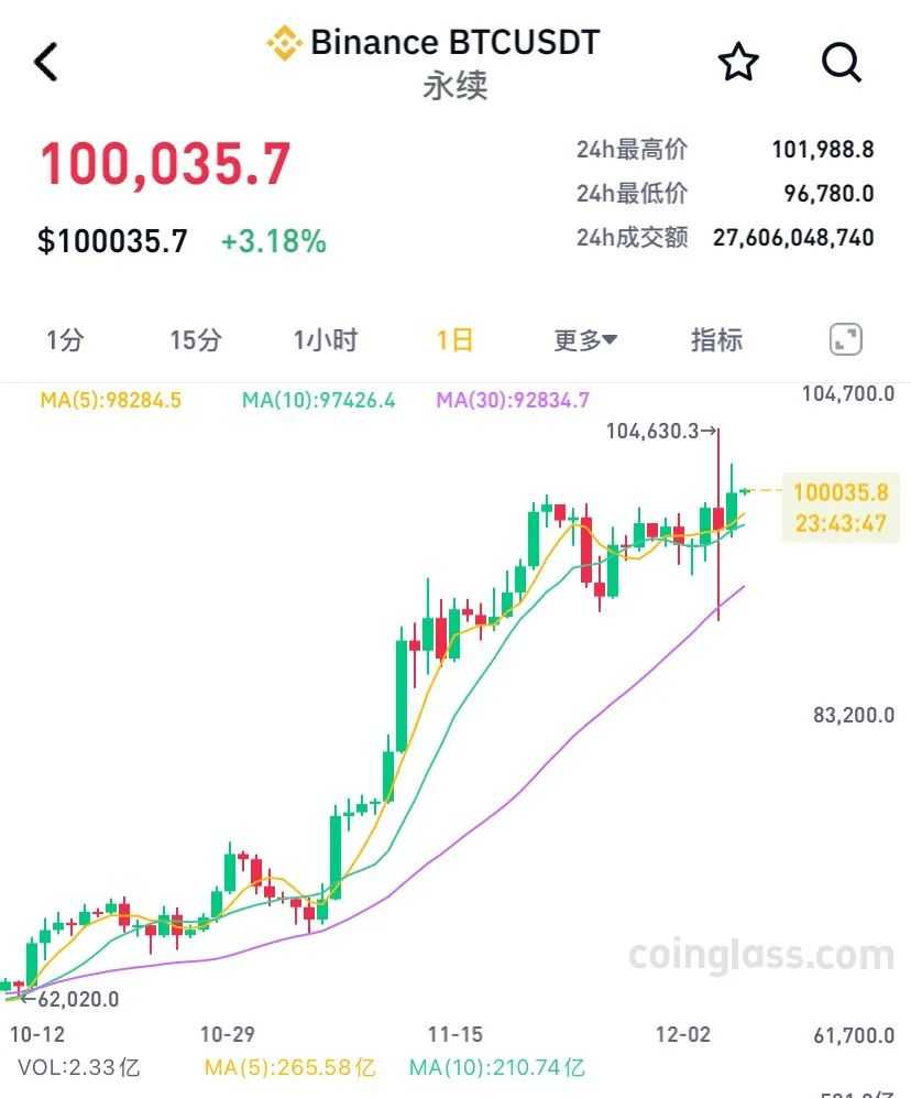 美东时间12月6日,比特币价格再次突破10万美元,CoinGlass数据显示,截至发稿时,比特币价格在10万美元一线波动,暂报100035.7美元。近七天内,现货比特币累计上涨约3%。此前,比特币价格曾在10月5日首次突破10万美元,但随后出现回调,最低跌至9万美元附近。