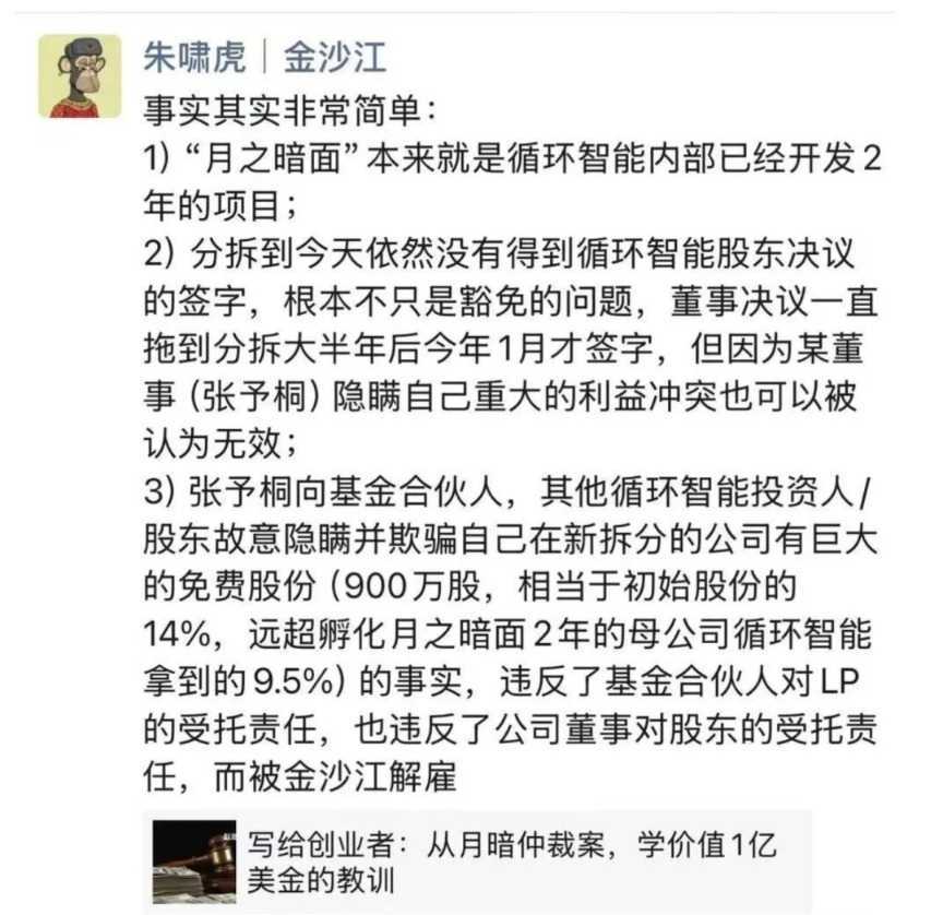 此事曝光后,金沙江创投主管合伙人朱啸虎在朋友圈连续发文,公开谈论投资人与月之暗面之间的矛盾,并表示循环智能的公司董事决议签字存在无效可能,因为董事张予彤隐瞒了重大利益,获得了月之暗面900万股免费股份,相当于初始股份的14%,远超母公司循环智能的9.5%。朱啸虎认为张予彤违背了基金合伙人对LP的受托责任,也违背了公司董事对股东的受托责任,因此被金沙江解雇。