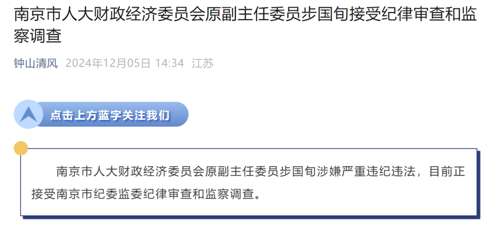 12月5日,南京市纪委监委通过官方公众号“钟山清风”发布通告,南京市人大财政经济委员会原副主任委员步国旬因涉嫌严重违纪违法正在接受调查。值得注意的是,此次调查距离步国旬退休已有3年之久。