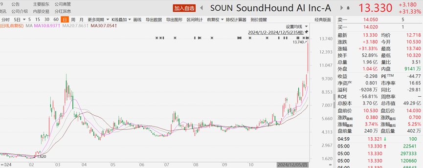 与此同时,“AI+语音”领域的SoundHound AI也表现出色,年内涨幅接近530%。SoundHound AI的AI语音技术能够直接理解语音含义,提高速度和准确性。其AI智能点餐服务已在Torchys Tacos的130家连锁餐厅上线,为顾客提供便捷的语音点餐体验。