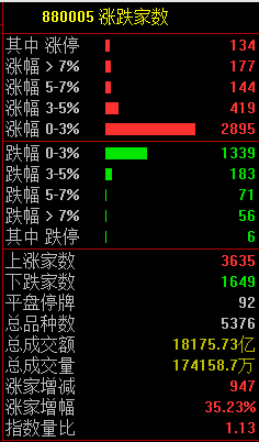 在个股表现方面,市场呈现出积极的态势,共有3635只个股上涨,其中134只个股涨停,相比之下,下跌的个股数量则相对较少,为1649只。