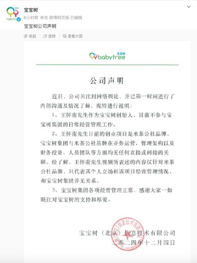 但随后,宝宝树集团发表声明称,此事与宝宝树并无关系,王怀南目前创业的项目是米茶公社品牌,与宝宝树在业务运营、管理架构以及财务投资、人员团队等方面均无任何直接或间接的关联。宝宝树官方账号也发文回应称,王怀南先生目前不参与宝宝树集团的日常经营管理工作。
