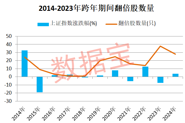 过往数据显示,翻倍股的数量与大盘走势并无明显关联。例如,2022年跨年期间,上证指数上涨12.52%,但翻倍股数量仅14只;而2023年跨年期间,上证指数下跌7.63%,翻倍股数量却达到了38只,为过去十年来的新高。