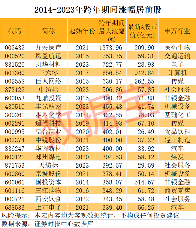 历史数据显示,在2014年至2023年的跨年期间,翻倍股中有6只个股涨幅超过5倍,分别是九安医疗、凤凰航运、凯华材料、三六零、巨人网络、中纺标。这些牛股的炒作热点均与当时市场关注的新冠检测、并购重组、先进封装材料、网络游戏、国企改革等题材相关。
