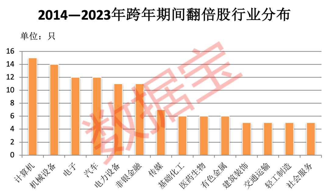 根据证券时报·数据宝的统计,以每年的11月1日至次年1月31日作为跨年周期,2014年至2023年期间,共有151只个股的最大涨幅实现了翻倍(与10月31日收盘价相比)。