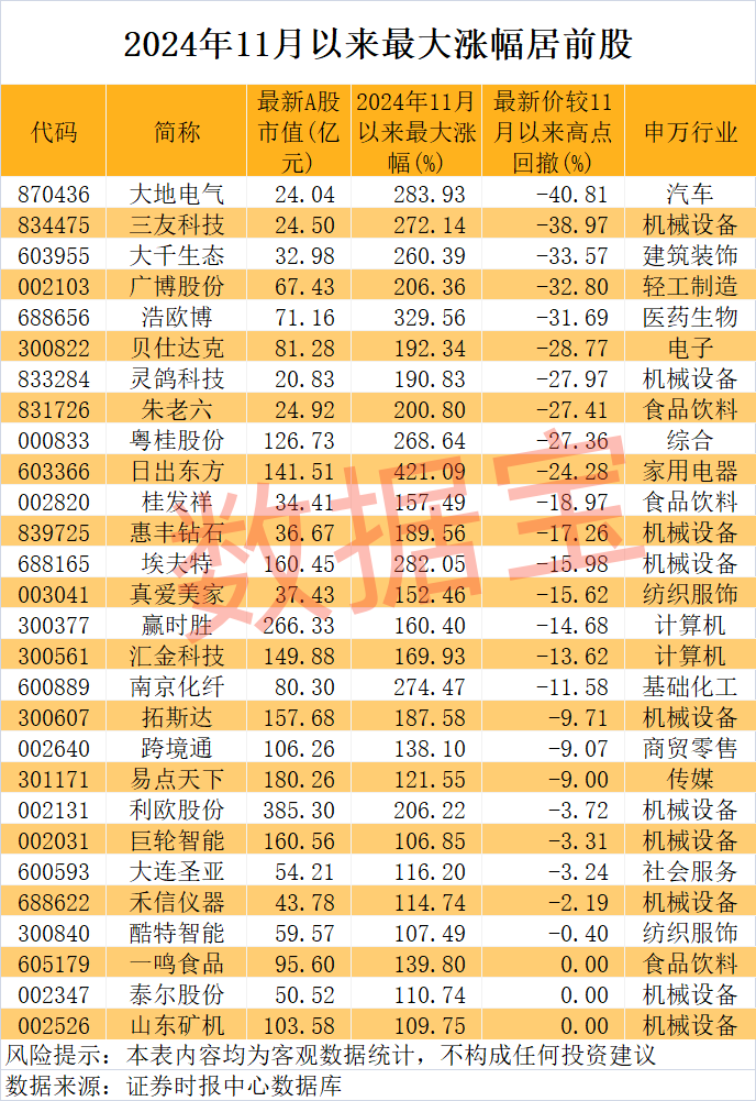 根据数据宝的统计,截至12月6日收盘,与10月31日收盘价相比,11月以来已有28股的最大涨幅实现了翻倍。日出东方的最大涨幅为421.09%,高居榜首,该股涉及充电桩、网红经济、智能家居、特斯拉概念,11月以来共收获15个涨停板,是同期A股市场收获涨停板最多的股票。在股价大涨前,该股的A股市值不到36亿元,股价不足5元/股。12月2日,该股创历史高点后股价回落,最新收盘价较历史高点回撤了24.28%。