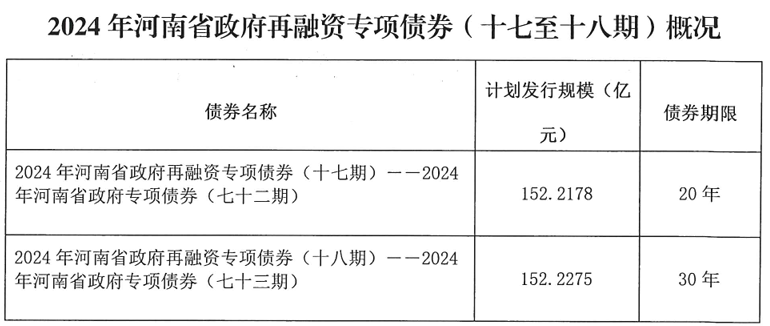 12月3日,河南省财政厅正式发布公告,宣布将于12月10日招标发行2024年河南省政府再融资专项债券(十七至十八期),并于12月11日起计息。此次发行的再融资专项债券旨在进一步优化债务结构,置换存量隐性债务。