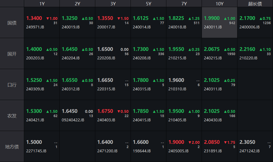 银行间主要利率债收益率多数呈现上行趋势。截至下午16:30,10年期国债活跃券240011收益率上行1bp至1.99%,30年期国债活跃券2400006收益率上行0.75bp至2.17%,10年期国开活跃券240215收益率亦上行0.75bp至2.07%。