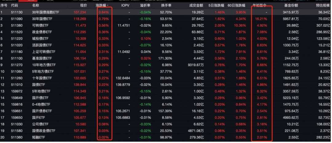 可转债ETF、政金债ETF、活跃国债ETF的单日涨幅也在30个BP到50个BP之间,债基投资者迎来了又一个收获满满的日子。