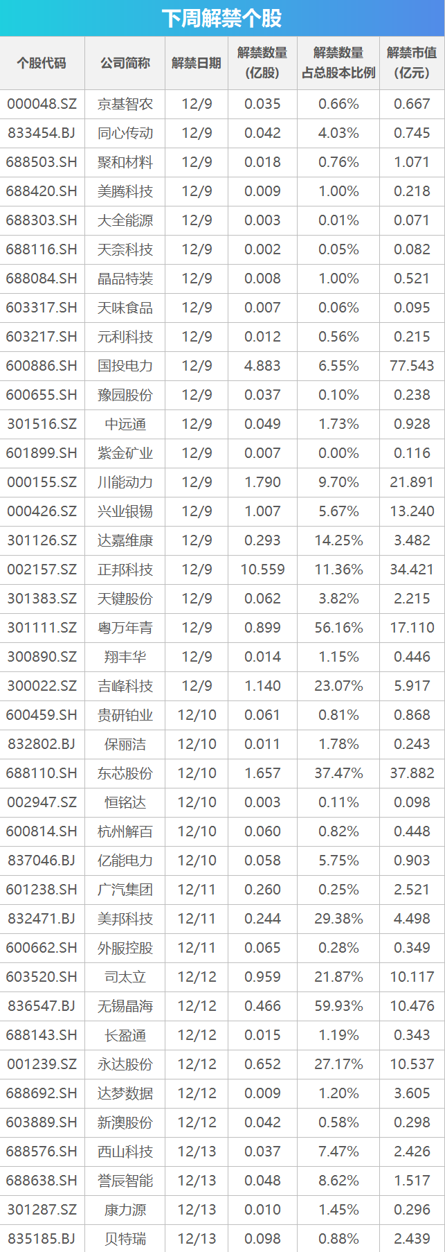 数据显示,下周A股限售股上市数量共计25.31亿股,以12月6日收盘价计算,解禁市值约265.44亿元,分别较本周下降45.24%、73.87%。这意味着市场面临的解禁压力有所减轻。