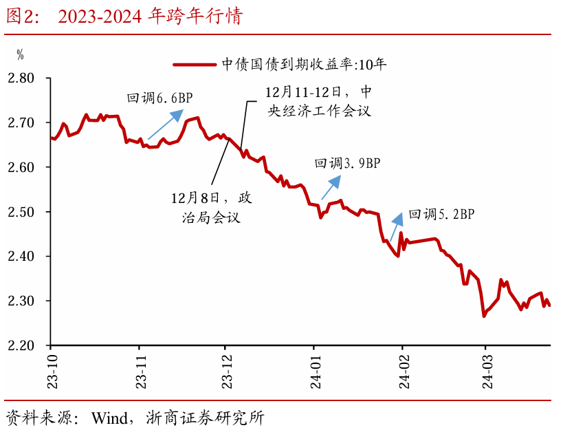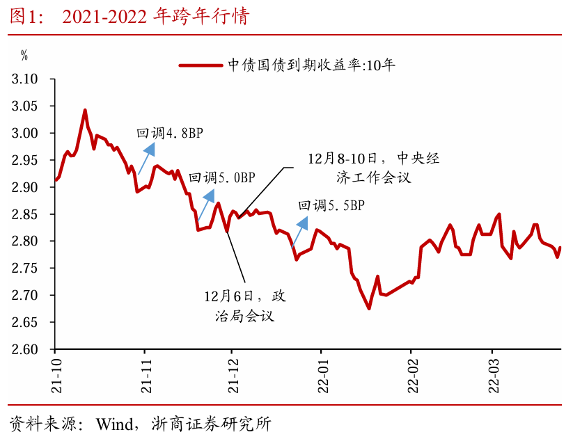 1、跨年行情历史复盘:跨年行情往往伴随4-7BP的短期调整。12月上旬的政治局会议及中央经济工作会议预期扰动,常成为债券行情回调的主要驱动。