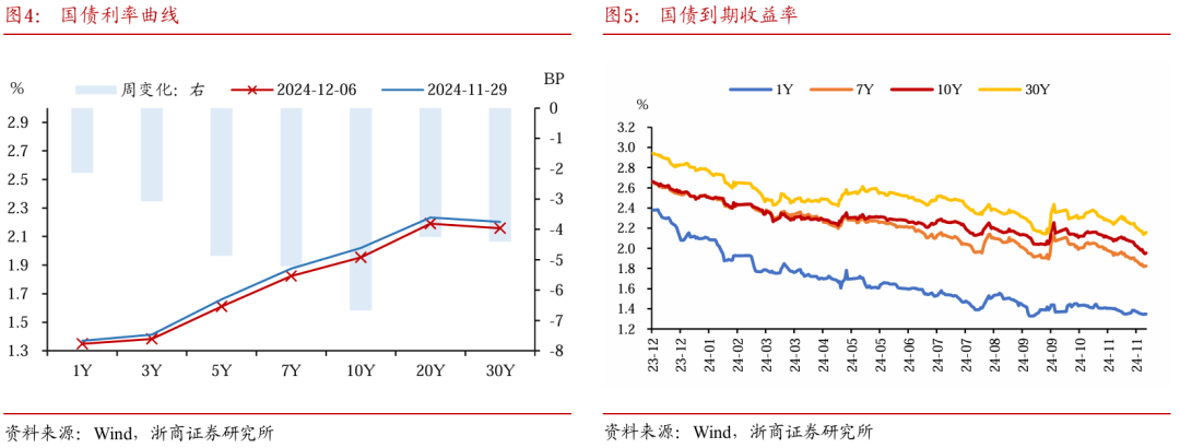 过去一周,10年国债收益率正式跌破2%关口。债券市场与权益市场基于不同逻辑均走强。债券市场交易现实显示,周一市场情绪高涨,10年国债收益率突破2%未遇阻,周二回调,周三及周四再度快速下行至1.943%,周五受权益市场情绪影响回调至1.955%。权益市场交易预期偏多,截至12月6日上证指数收报3404.08点。