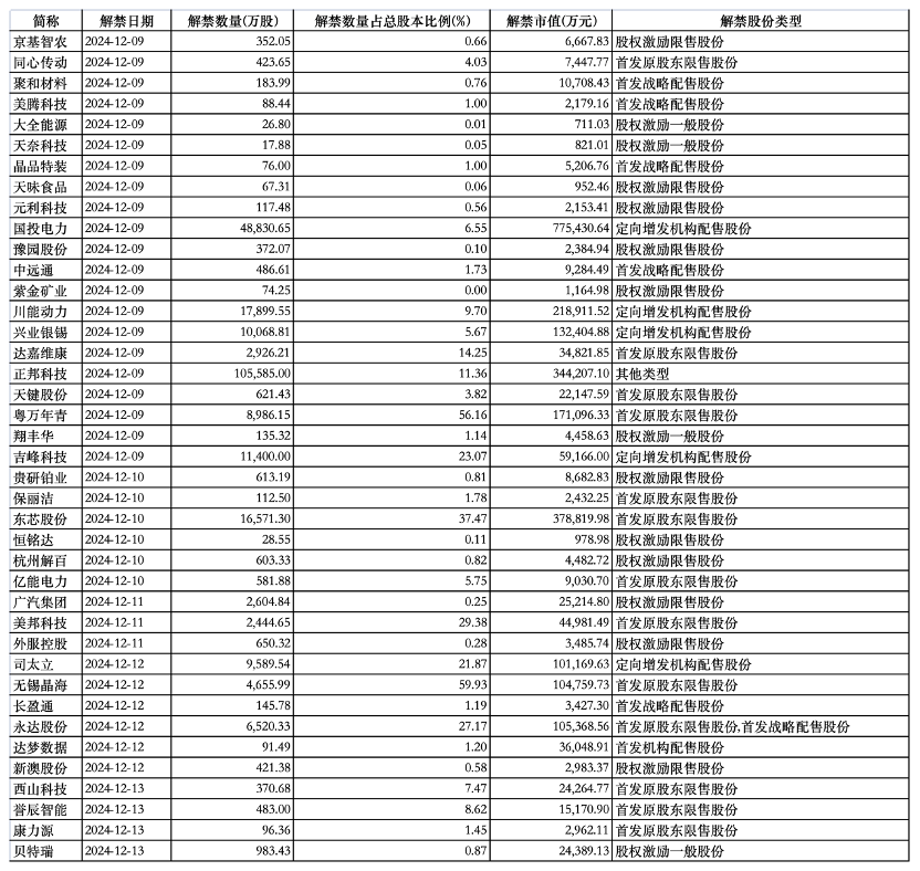 上证报中国证券网讯(记者王彦琳)最新数据显示,下周A股市场将迎来一波限售股解禁高峰,总共有40家公司限售股将陆续解禁,涉及解禁数量高达25.63亿股。按最新收盘价估算,这些解禁股票的市值总计达到271.10亿元。特别值得关注的是,12月9日将成为解禁高峰期,当天共有21家公司面临限售股解禁,其解禁市值超过181亿元,占据了下周总解禁规模的近70%。