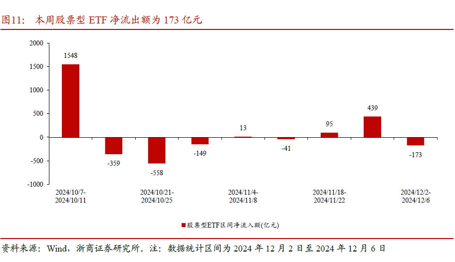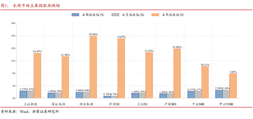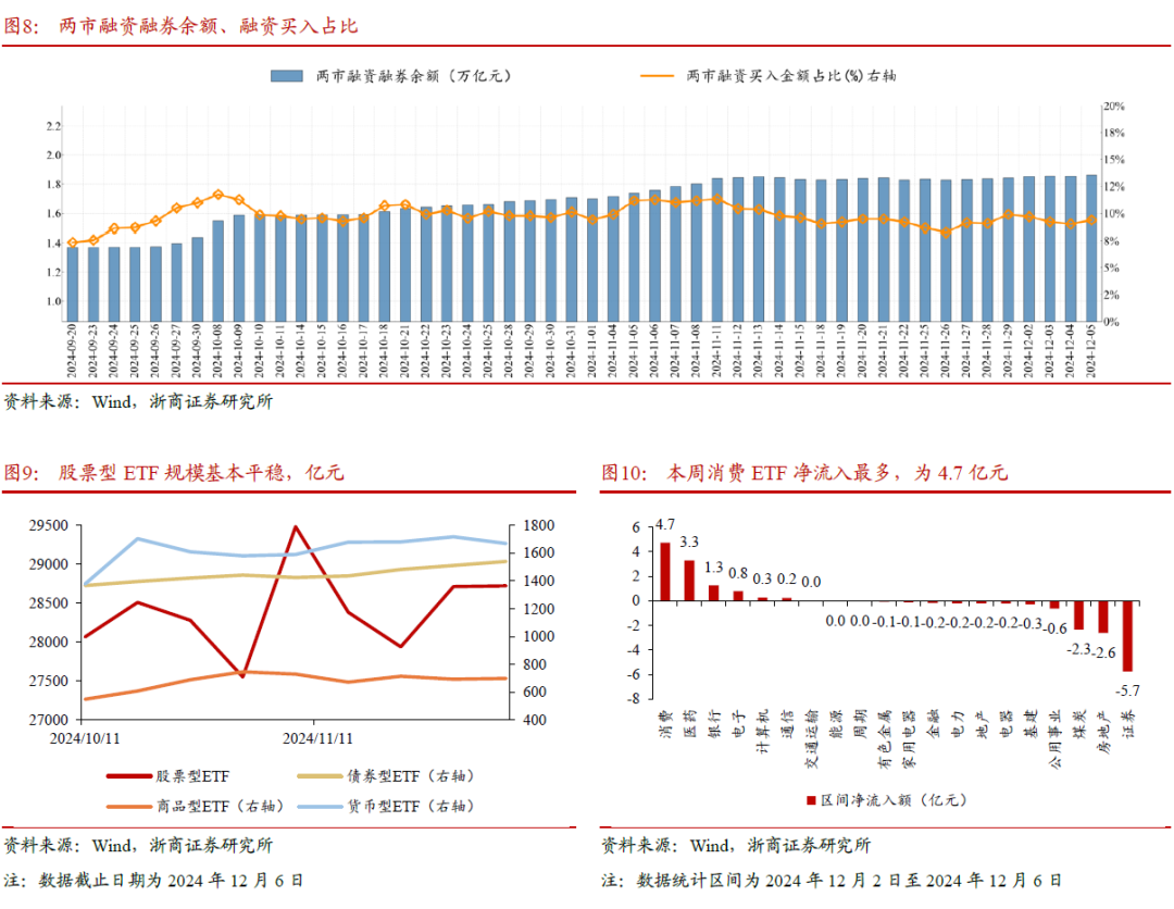 本周市场经历震荡后呈现反弹趋势,中证1000指数表现尤为突出,涨幅居前。板块方面,多个领涨板块活跃,但泛消费板块表现相对较弱。市场情绪方面,沪深两市的成交额有所回升,股指期货合约多数呈现贴水状态。在资金流向方面,两融余额回升,融资买入占比也有所增加。ETF市场方面,本周股票型ETF资金净流出,而消费ETF资金净流入最多。此外,创业板指仍处于估值底部,下跌能量模型维持在正常水平。