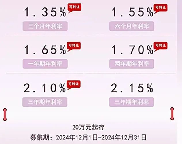 除地方性银行外,部分股份行也在年末加入了大额存单产品的竞争行列。例如,中信银行推出了一款包含5档期限的大额存单产品,年利率在1.35%至2.1%之间。而浦发银行石家庄分行也发行了5档期限的大额存单产品,其中3年期年利率为2.15%,且当日购买即可当日起息。