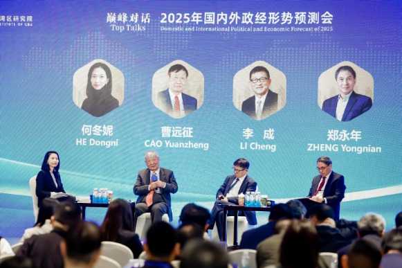 (论坛现场,嘉宾们热烈讨论2025年国内外政经形势。广州粤港澳大湾区研究院供图)