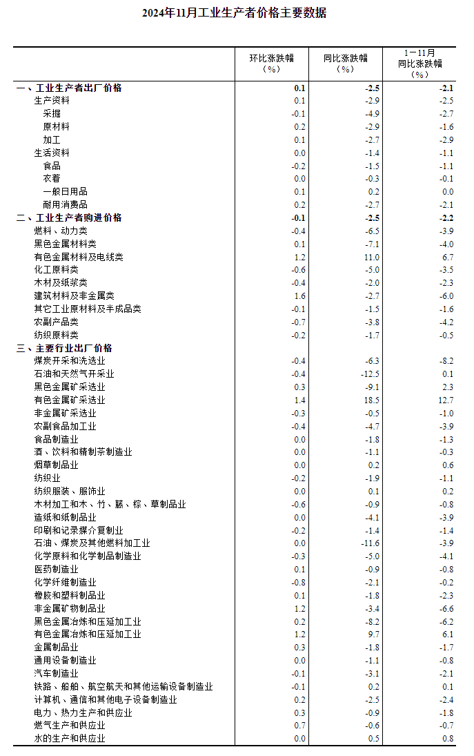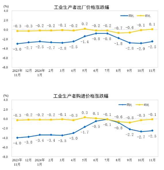 国家统计局发布11月工业生产者价格指数月度报告,详细阐述了工业生产者出厂价格和购进价格的同比及环比变动情况。