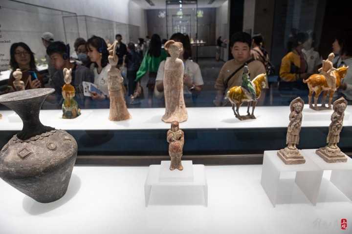 在上海博物馆东馆陶瓷馆,观众们欣赏着彩色人俑,感受中国陶瓷文化的博大精深。
