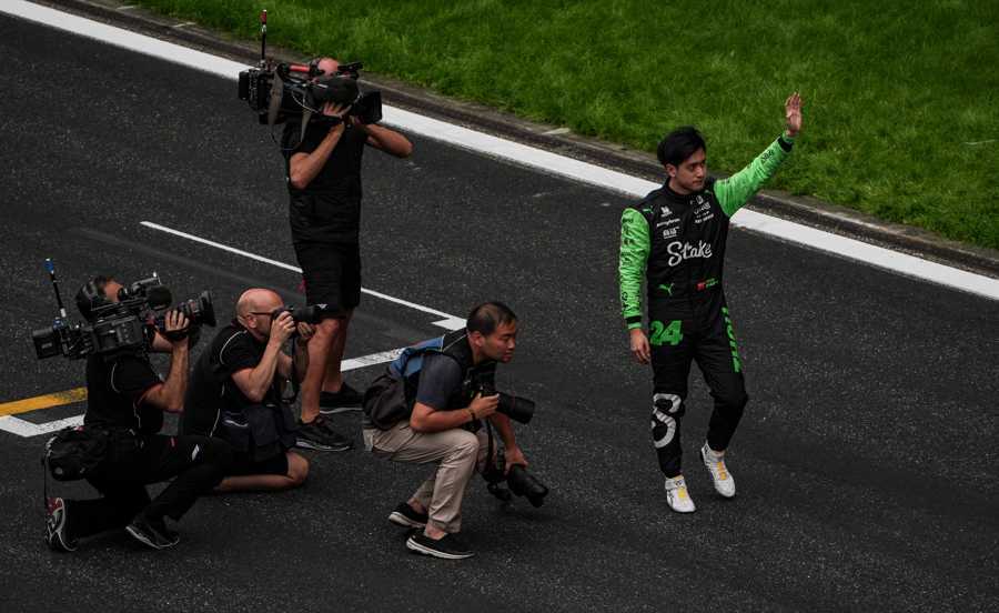 在2024F1中国大奖赛上,索伯车队中国车手周冠宇向观众挥手致意,展现了中国赛车运动的风采。