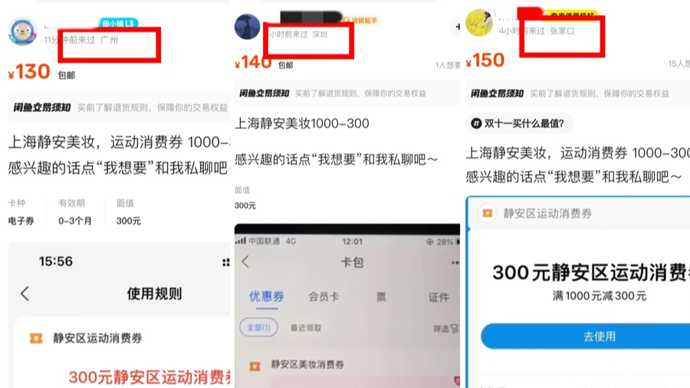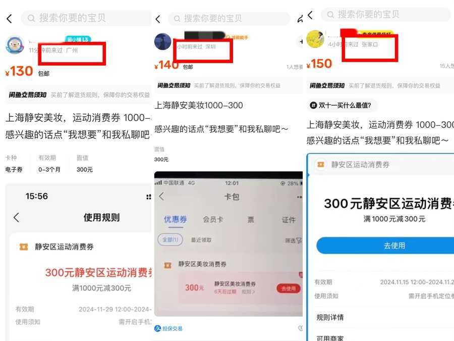 今年11月,浦东新区和静安区发放了高额区级消费券,消费者领券热情高涨,但抢券难度大。然而,在闲鱼等二手平台上,却出现了大量转卖消费券的信息,甚至包括外地IP地址的卖家。这些卖家通过虚拟定位软件突破消费券申领的地域限制,抢得消费券后再进行转卖。