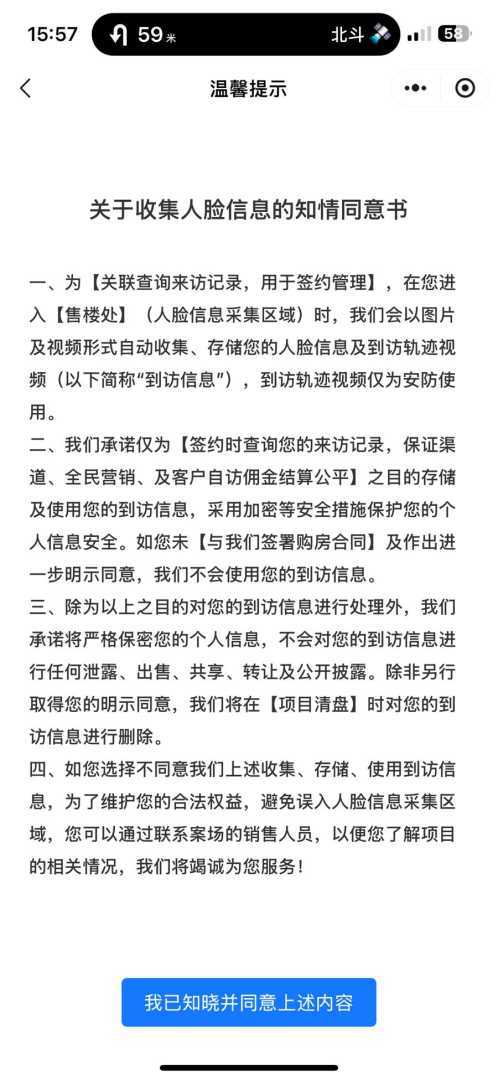 资深房地产经纪人小周透露,几乎所有新楼盘都会进行人脸识别,以区分客户来源并精确计算佣金。记者走访了浦东新区的多个新楼盘,发现看房过程中,销售人员均未明示人脸识别操作。但在中企·云萃森林楼盘,小程序首次弹出了《关于收集人脸信息的知情同意书》。而在永泰三里城楼盘,记者发现售楼中心正门口、沙盘区域等位置上方均安装了监控设备。