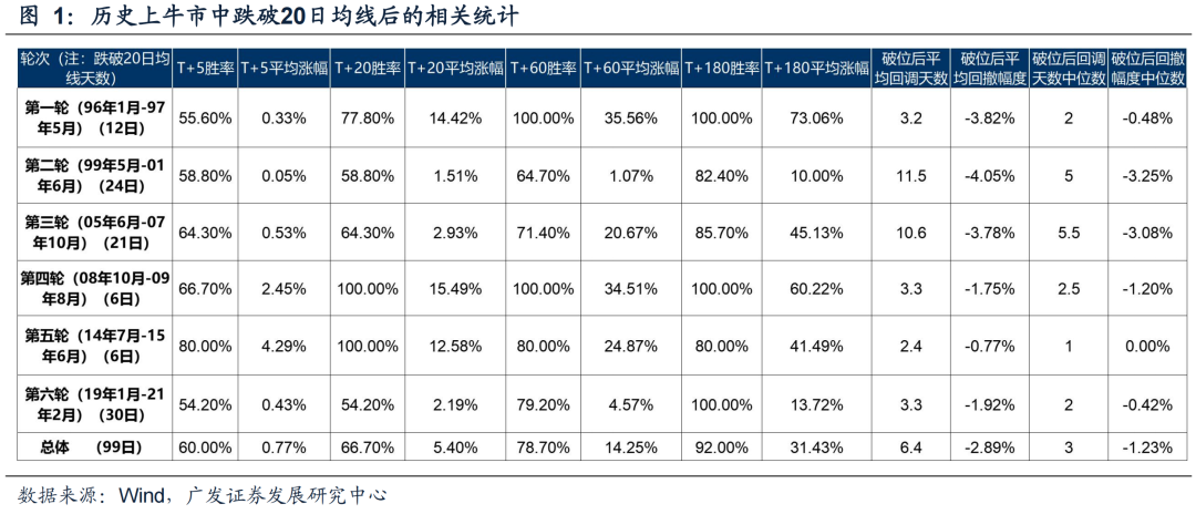 1. 过去六轮牛市中,阶段性跌破20日均线共99次,并不罕见。