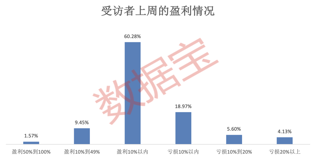 上周,上证指数累计上涨2.33%,深证成指上涨1.69%,创业板指上涨1.94%。在市场普涨的情况下,多数受访者表示盈利,超六成受访者盈利在10%以内,10%左右受访者盈利超过10%,约1.6%受访者盈利超过50%。