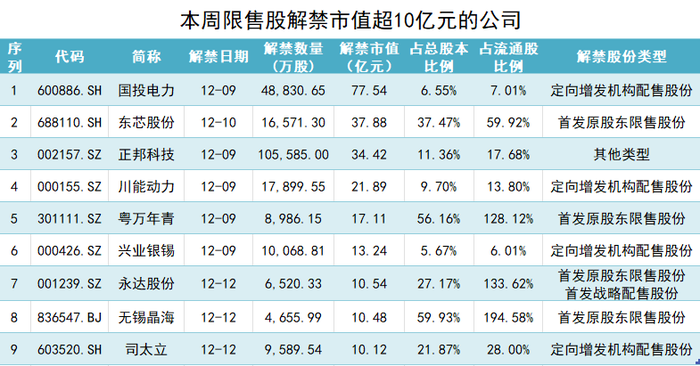 本周A股限售股解禁规模环比下降,国投电力等三公司解禁市值居前