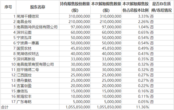 猪肉股正邦科技本周也有大量的限售股解禁,共计10.56亿股,占总股本比例11.36%,解禁市值约为34.42亿元。此次解禁涉及股东共17位,为一年前重整投资人的转增股票,限售期12个月。解禁筹码分散,解禁压力较大。然而,经过重整后,正邦科技的业绩正在逐步好转。公司预计年底的能繁母猪数量将有28万头以上,对应明年的整体出栏数量预计在700万头以上。此外,公司还存在资产注入预期。