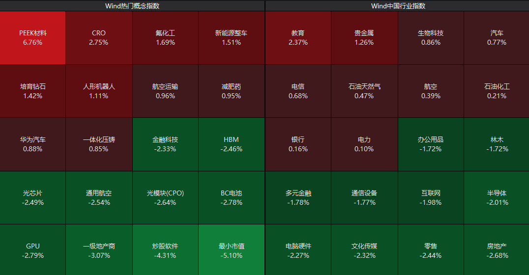 板块方面,机器人概念股表现抢眼,盘中持续走高,带动PEEK材料、工业机械等相关板块强势上涨。生物科技、汽车、食品等板块同样活跃,而房地产板块则跌幅居前,零售、文化传媒、炒股软件等板块则呈现震荡调整态势。