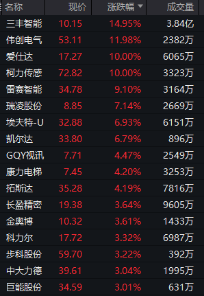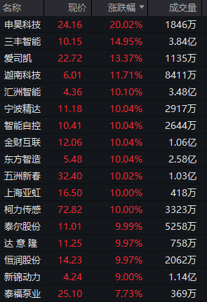 具体来看,机器人概念股成为今日市场的亮点,三丰智能、伟创电气等个股涨幅居前,柯力传感、爱仕达更是强势涨停。工业机械概念股同样不甘示弱,申昊科技20CM涨停,汇洲智能、宁波精达、东方智造等多只个股也纷纷涨停。