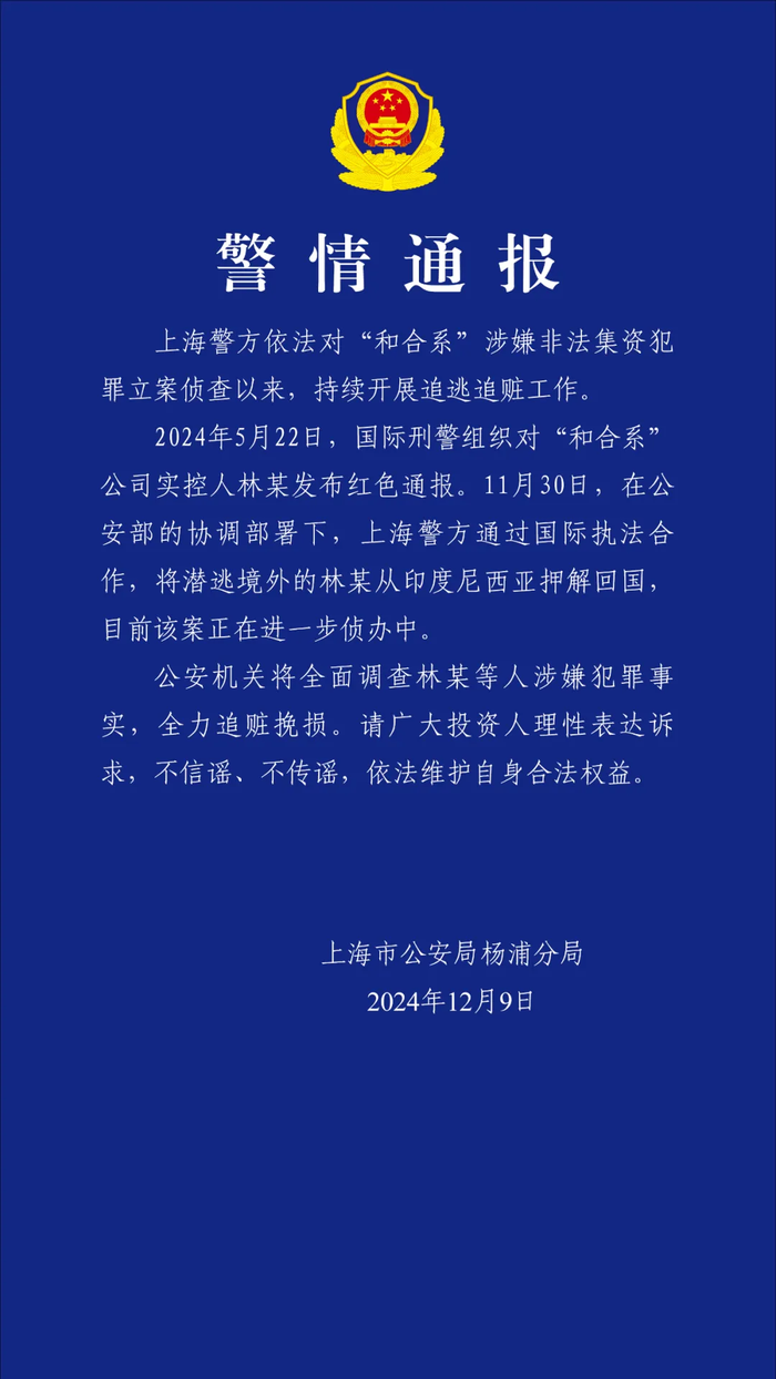 上海警方成功通过国际执法合作将“和合系”公司实际控制人林某从印度尼西亚押解回国,案件正在进一步侦办中。警方呼吁投资人理性表达诉求,依法维权。