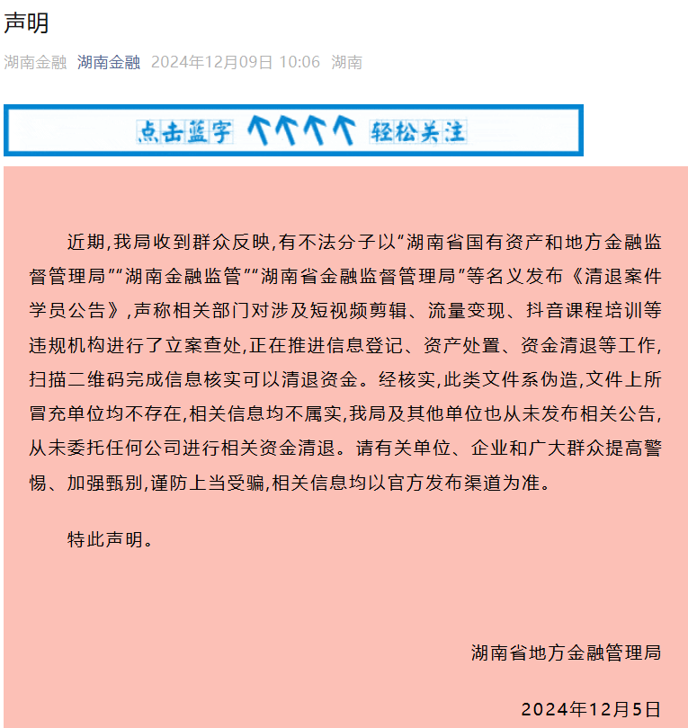 12月9日,湖南省地方金融管理局发布声明,称有不法分子假冒官方名义发布虚假的《清退案件学员公告》,诱导受害者扫描二维码完成信息核实以骗取资金,呼吁广大单位、企业及民众提高警惕,所有官方信息均应以官方发布渠道为准。