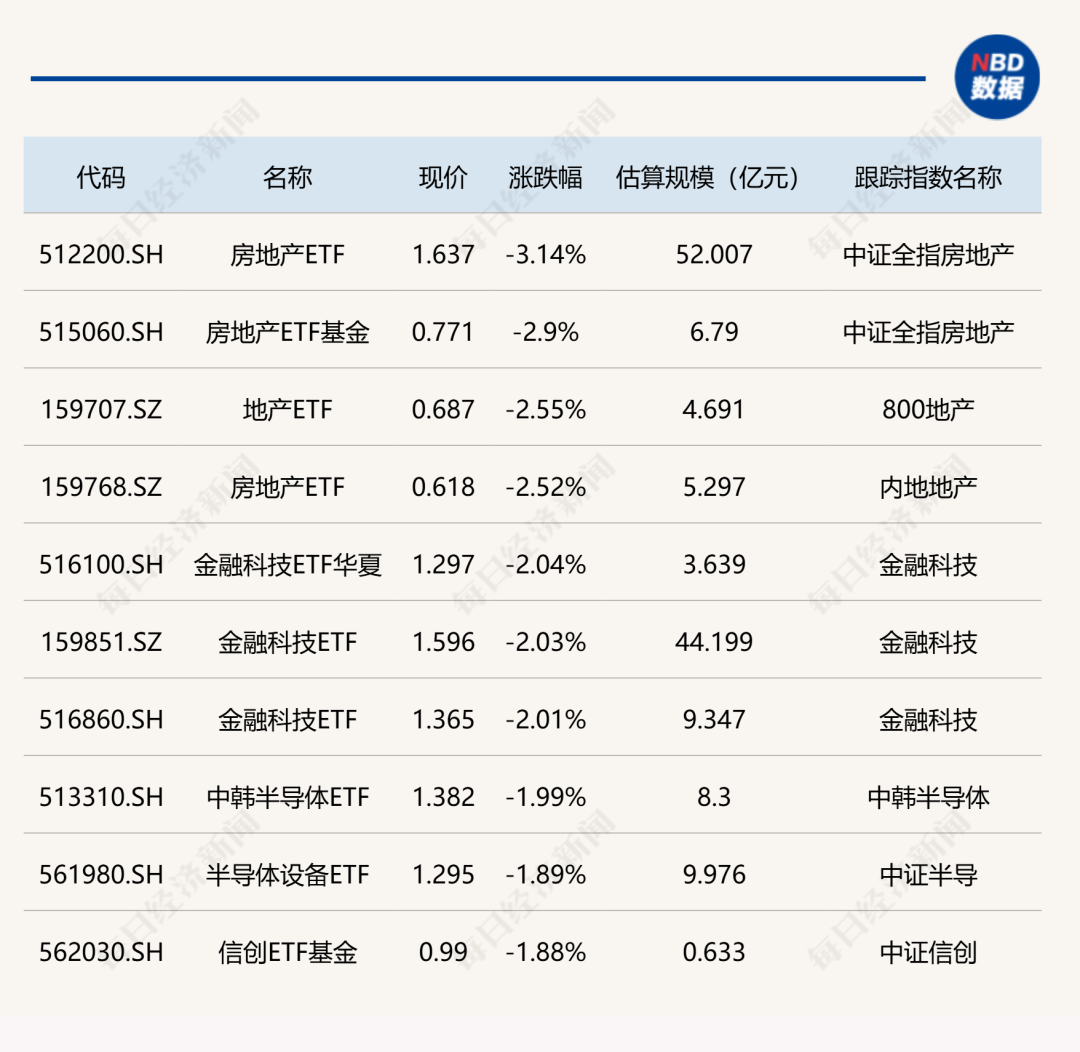 下跌方面,房地产相关ETF跌幅超过3%,金融科技ETF跌幅也超过2%,显示出市场对这两个板块的担忧。