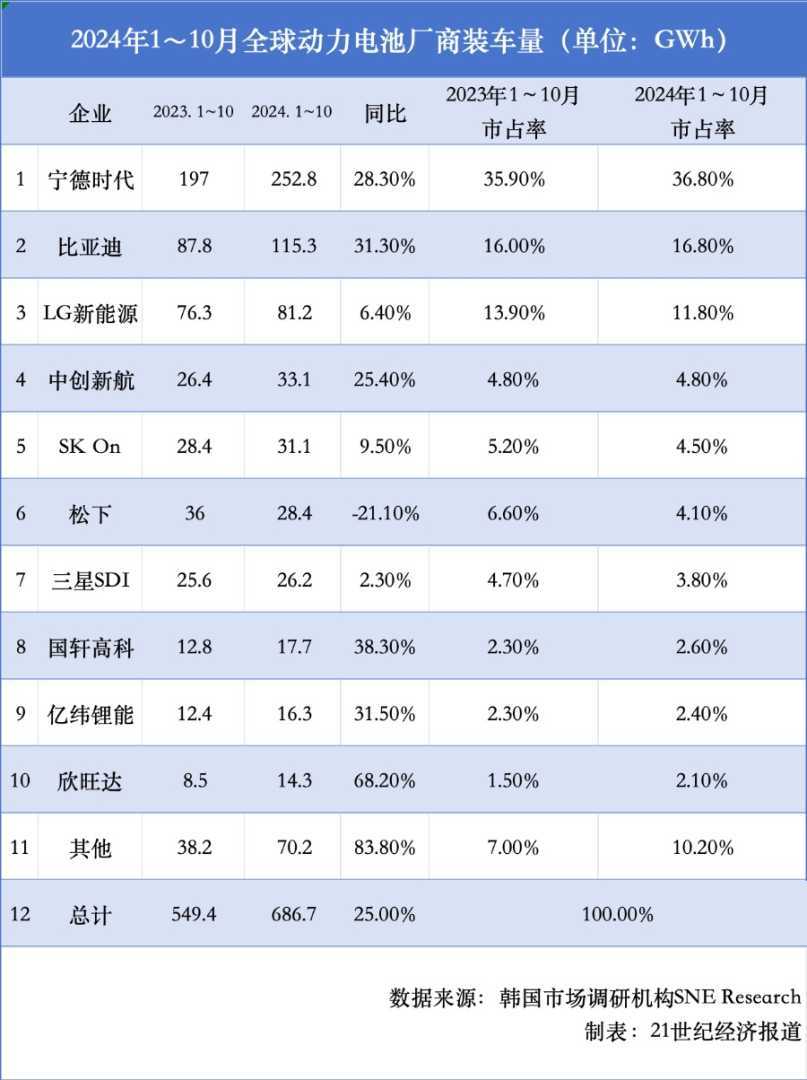 相比之下,韩系和日系动力电池厂商则面临较大挑战。三家在榜韩企的平均增速仅为6.07%,总市占率下滑至20.2%。而日系厂商中,仅松下一家在榜,且前10月装车量大幅下滑21.1%,市场份额缩水至4.1%。