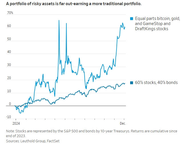 尽管金融专家频频发出警告,但今年这些年轻投资者确实赚得盆满钵满。一项数据显示,持有等量比特币、黄金、网红股GameStop和体育博彩股DraftKings的投资组合,在今年前11个月的回报率高达62%,远超传统60/40股债投资组合的回报率。这种高风险投资的回报率,甚至让今年美股大盘约27%的涨幅也黯然失色。